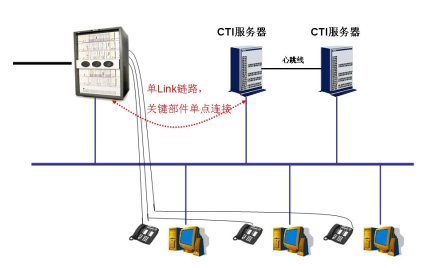 中汽網(wǎng)呼叫中心采用了Hi-Link產(chǎn)品的鏈路級(jí)雙機(jī)熱備解決方案,為核心部件CTI提供真正可靠的保障。以往的CTI產(chǎn)品在與PBX連接的時(shí)候,都是采用PBX廠家提供的“API層”接口,該接口只能部署到一臺(tái)服務(wù)器上,進(jìn)而也使得采用雙機(jī)熱備方案的CTI服務(wù)器存在單點(diǎn)故障,如圖所示: