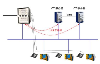 采用Hi-Link鏈路級(jí)雙機(jī)備份機(jī)制可有效地防止呼叫中心系統(tǒng)單點(diǎn)故障的發(fā)生。呼叫中心兩臺(tái)互為熱備的CTI系統(tǒng)通過(guò)獨(dú)立的CTI Link鏈路連接到交換機(jī),使得該雙機(jī)熱備方案真正成為無(wú)單點(diǎn)故障的熱備方案。系統(tǒng)框圖如下: