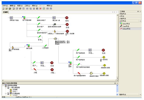 Hi-Link提供圖形化、流程式的ACD路由策略定制工具,實(shí)現(xiàn)ACD流程的靈活定義和配置。該工具不僅僅實(shí)現(xiàn)了流程邏輯、資源管理和數(shù)據(jù)庫(kù)訪問(wèn)的可配置,而且可以在流程中內(nèi)嵌VBScript處理邏輯,進(jìn)而實(shí)現(xiàn)更加強(qiáng)大的路由管理能力。如圖所示: