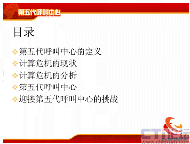 我把第五代呼叫中心的概念詳細地論述一下。主要是分成五個部分,第一個是第五代呼叫中心的定義;第二個計算危機的現(xiàn)狀;第三是計算危機的分析;第四第五代呼叫中心;第五是結(jié)論——迎接第五代呼叫中心的挑戰(zhàn)。