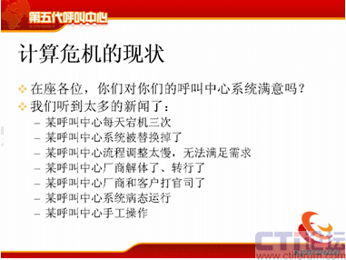 呼叫中心現(xiàn)在已經(jīng)了比較嚴重的計算危機,我聽到了很多,因為我重點是在搞技術(shù)這一行當,我就問一個問題,在座的各位,你們對你們的呼叫系統(tǒng)滿意嗎?我相信大部分人可能嘴上都說比較滿意,但是很多人對深層次的矛盾都非常清楚,為什么不滿意?