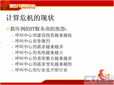 我們聽到IT服務商的抱怨可就更多了,說呼叫中心建設投資越來越低了,我在十年前建設一個20個座席的呼叫中心,能掙1500萬;可是現(xiàn)在20個座席的呼叫中心,10萬塊錢就把我打發(fā)了。呼叫中心競爭越來越激烈,投一個標,雖然一個呼叫中心只有100萬,這時候來的廠家有50家,相互壓價,相互壓價,這時候利潤都沒有了。現(xiàn)在的需求是越來越多了,體現(xiàn)在各個環(huán)節(jié),運營管理和業(yè)務模式上需求越來越多,最終客戶的要求也是越來越多,系統(tǒng)越來越大了,服務器也一大堆,以前一兩個服務器就夠了,現(xiàn)在需要4、5個,7、8個,這些服務器還需要相互進行聯(lián)絡整合,系統(tǒng)的整合越來越多,比如要和ERP整合,要和CRM整合,要和供應鏈整合,系統(tǒng)的整合越來越多,而且需求變化越來越大,呼叫中心需求的變化產(chǎn)生于很多方面,后面我會仔細介紹。呼叫中心的行業(yè)變成一個夕陽行業(yè)了,這是現(xiàn)在做IT服務商普遍在提的想法。