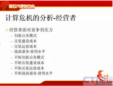 那么經(jīng)營者的壓力就更大了,首先我要創(chuàng)新業(yè)務模式,我以前是做客戶服務的,現(xiàn)在我要掙錢,我要增加收入,我要做電話營銷,壓低建設成本,壓低運營成本,這個是大家很容易理解的。同時他是不斷地創(chuàng)新業(yè)務模式,不斷地壓低建設成本,不斷地壓低運營成本,不斷地提高服務水平,這個不斷就給IT服務者傳遞了更大壓力。