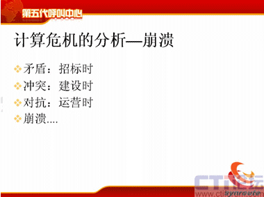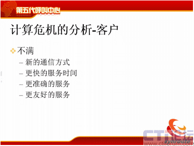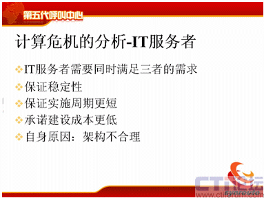 我分析一下計算的危機,計算危機來源于三個方面,第一是客戶面對不斷提升的服務水平,現(xiàn)在需要新的通信方式,包括電話、傳真、短信、電子郵件等等,還包括網(wǎng)上的護航瀏覽,表單共享,電子排版等等通信方式。第二方面需要更快的服務時間,80%的電話是20秒接起,可是短信的響應時間為什么這么長,需要更準確的服務,電話的服務是什么樣的,我現(xiàn)在需要網(wǎng)上交談的服務質(zhì)量也能夠得到保障等等,這是客戶對IT服務者提供的壓力。