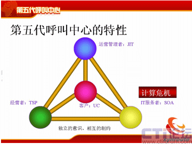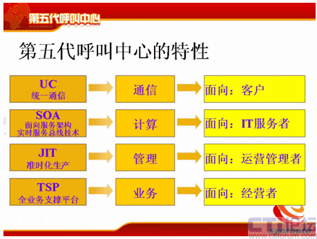 從分代上來講,和何總說的稍微有點差異,但是基本上一樣的,第一代是人工熱線的電話系統(tǒng),時間點也差不多;第二代是有了座席IVR、自動語音應答這個特點;第三代是有了CTI、ACD企業(yè)級的呼叫中心;第四代是互聯(lián)網(wǎng),有VOIP、多媒體等等這些多媒體的呼叫中心。那么第五代是什么?第五代的典型特征是融合共享,它是有四個特性,UC、SOA、JIT和TSP,這是五代的幾個主要特點。