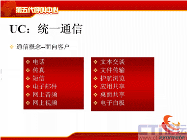 那么這幾個特點稍微簡單地說一下,可能大家了解比較多了,從UC上來講,不管是現(xiàn)在國際上比較領(lǐng)先的通信廠商,CISCO、華為都在提UC的概念,軟件行業(yè)包括微軟。UC包括了通信的渠道,包括電話、傳真、短信、電子郵件、網(wǎng)上音頻、視頻,文本交談,文件傳輸、護航瀏覽、應用共享、桌面共享等等,這是統(tǒng)一通信的部分。