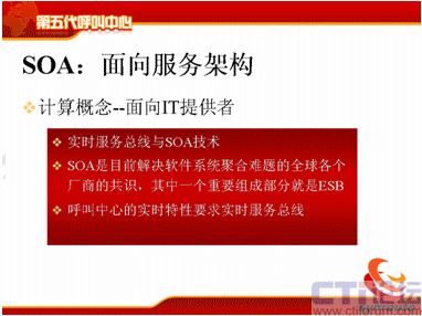 SOA就是面向服務的架構(gòu),這個概念近兩、三年來在中國的發(fā)展是比較快的,計算的概念,它是面向IT提供者。實時服務總線技術(shù)與SOA,SOA是目前解決軟件系統(tǒng)聚合難題的全球各個廠商的共識,其中一個重要的概念是ESB,不知道大家清楚嗎?就是企業(yè)服務總線,是SOA里面重要的組成部分,呼叫中心的實時特性要求,這個服務總線不是普通的服務總線,而是實時的服務總線。