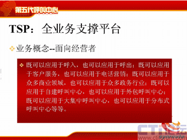 TSP這個概念其實比較清晰,比較簡單,它的意思就說對于呼叫中心來說,它能支持各種業(yè)務,既可以支持呼入,也可以支持呼出;既可以應用于客戶服務,也可以應用于電話營銷;既可以應用于商業(yè)領(lǐng)域,也可以應用于政務領(lǐng)域;既可以用于自建,也可以用于外包;可以是大規(guī)模集中的,也可以是分布式的。