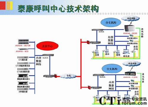泰康電銷中心采用交換機+CTI+錄音+應用系統(tǒng)組成。在中心點普遍采用交換機模式。當中心點坐席規(guī)模大于60席位以數字中繼模式接入。當分點新建數量不足60座席時,采用遠端模式,相應采用交換機遠端模塊+CTI+錄音+應用系統(tǒng)組成。