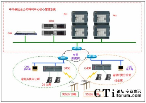 中華保險(xiǎn)呼叫中心采用IP分布式架構(gòu),總公司由一套S8730媒體服務(wù)器,4個(gè)G650組成2個(gè)PN,外加一臺(tái)CMS報(bào)表服務(wù)器組成。各地分支機(jī)構(gòu)采用G450網(wǎng)關(guān)通過(guò)中華保險(xiǎn)內(nèi)部數(shù)據(jù)專用網(wǎng)絡(luò)與總公司核心管理系統(tǒng)交互。其中省級(jí)B類分公司為60數(shù)字中繼線接入,48坐席。省級(jí)A類分公司為30路數(shù)字中繼接入,24坐席。各公司坐席采用AVAYA2410D數(shù)字話機(jī),可以提供豐富的呼叫中心話機(jī)功能,方便坐席人員使用。