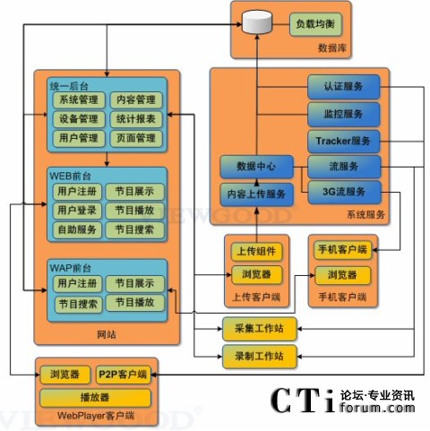 系統(tǒng)由“統(tǒng)一”管理后臺、Web前臺、WAP前臺、WebPlayer播放器、手機客戶端、采集工作站、錄制工作站、上傳客戶端、服務(wù)系統(tǒng)組成。之前已經(jīng)使用我們PC流媒體服務(wù)平臺的用戶,可以與手機流媒體系統(tǒng)合用一個后臺管理,實現(xiàn)了手機和PC平臺的統(tǒng)一后臺管理。