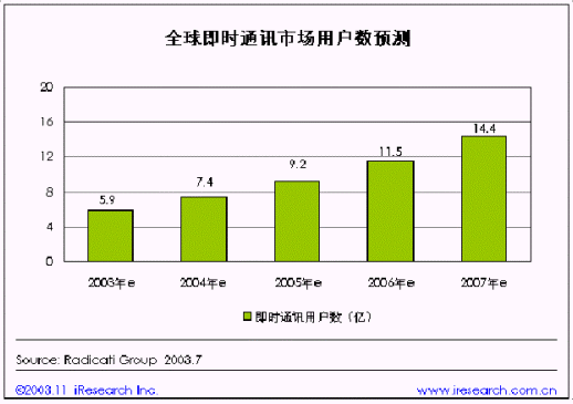 年即時通訊將成為互聯(lián)網上最普及的交流方式。隨著即時通訊的普及,全球即時通訊用戶規(guī)模也在不斷擴大。即時通訊市場龐大的用戶規(guī)模和增長潛力早已引起了業(yè)內巨頭的激烈競爭。以美國為例,目前,AOL、MSN