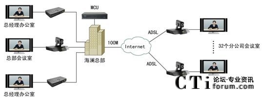 2009年6月,領(lǐng)先的視訊廠商科達(dá)攜TrueSens(致勝)視頻會(huì)議系統(tǒng)走進(jìn)海瀾,為海瀾集團(tuán)搭建了一套覆蓋總部2個(gè)領(lǐng)導(dǎo)辦公室、1個(gè)銷售會(huì)議室及全國32個(gè)分公司的視頻會(huì)議系統(tǒng)。整個(gè)方案在部署上非常便捷,海瀾江陰總部的機(jī)房架設(shè)一臺高、標(biāo)清一體化多點(diǎn)控制單元(MCU),銷售會(huì)議室、集團(tuán)王總、陶總的辦公室以及海瀾集團(tuán)在全國的32個(gè)分公司銷售會(huì)議室則各部署一套視頻會(huì)議終端。總部帶寬為100M,分支機(jī)構(gòu)則均通過普通ADSL接入。系統(tǒng)拓?fù)鋱D如下: