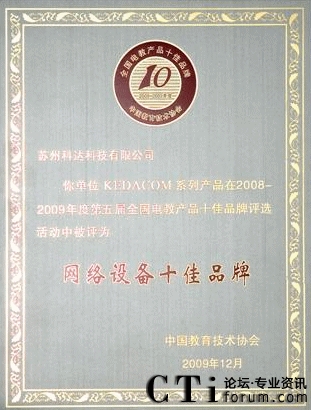 CTI論壇(ctiforum)12月14日消息(記者 張塵):2009年12月4日,由國內(nèi)教育權威機構(gòu)“中國教育技術協(xié)會”主辦,以讀者調(diào)查問卷的形式舉行的第五屆全國電教產(chǎn)品十佳品牌頒獎典禮在福州梅峰賓館盛大開幕,科達教育視頻會議產(chǎn)品憑借卓越的產(chǎn)品性能和良好的客戶服務入選網(wǎng)絡產(chǎn)品類十佳之列,同時也成為首個入選十佳品牌的視頻會議產(chǎn)品。