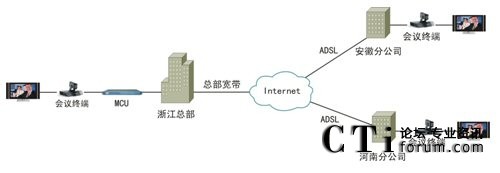 該套視頻會議系統(tǒng)最大的特點就是擁有超強的網(wǎng)絡(luò)適應性。由于采用了高效視音頻編碼技術(shù)和大量智能化網(wǎng)絡(luò)適應技術(shù),無論是ADSL、光纖還是VPN,均可進行快速接入,并充分保證在Internet環(huán)境下的會議效果。因此,天元置業(yè)此次視頻會議系統(tǒng)就是完全基于公司現(xiàn)有的Internet進行部署的。如圖1。