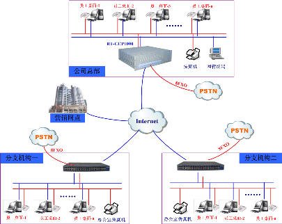 生產(chǎn)總部與分支機(jī)構(gòu)、營(yíng)銷(xiāo)網(wǎng)點(diǎn)實(shí)現(xiàn)統(tǒng)一辦公電話功能(即VOIP組網(wǎng)+辦公電話功能)。
