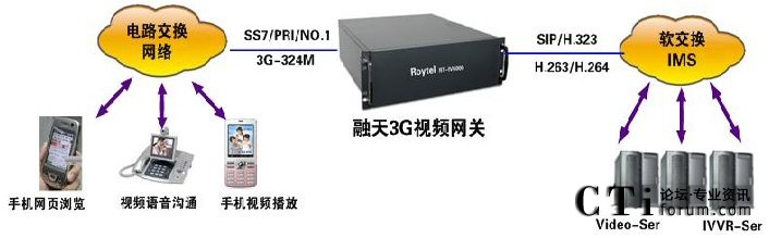 融天科技RT-IV6000硬件平臺(tái)非常簡(jiǎn)單,通過(guò)E1或PRI與3G的移動(dòng)交換機(jī)MSC相連接,實(shí)現(xiàn)3G網(wǎng)絡(luò)與IP的對(duì)接。從而提供3G用戶、SIP用戶、H.323用戶或其他用戶訪問(wèn)視訊業(yè)務(wù)。接入部分保證了視訊平臺(tái)與移動(dòng)網(wǎng)絡(luò)的順利接入以及與其