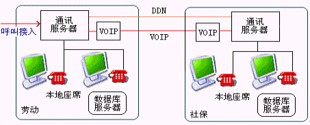 如某些城市勞動(dòng)和社保是業(yè)務(wù)分開,為共用12333接入號(hào)可采取此種方式,在呼叫首次接入時(shí)提示用戶選擇勞動(dòng)、還是社保咨詢服務(wù),如果選擇社保服務(wù)則通過(guò)DDN專線或VOIP將呼叫接入到社保的交換機(jī)中。