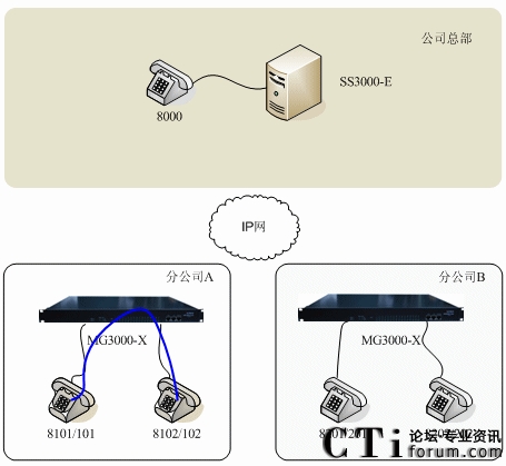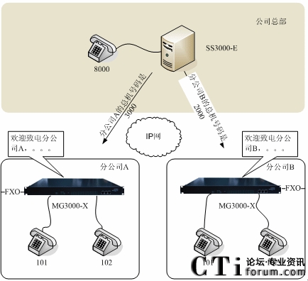 圖三:方案3:SS3000-E與IPPBX MG3000-X聯(lián)合組網(wǎng)示意圖