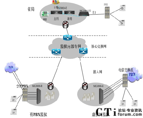 在有PBX監(jiān)獄部署智能路由網(wǎng)關(guān)MG3000-R32(或者數(shù)字中繼網(wǎng)關(guān)MG3000-T4),網(wǎng)關(guān)通過10/100Base-T以太網(wǎng)接口連接IP網(wǎng)絡(luò),注冊到軟交換平臺(tái)通過路由匯接,成功的把全省各監(jiān)獄的內(nèi)部電話互連互通起來。