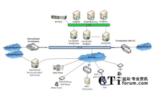 計(jì)費(fèi)系統(tǒng)將把視頻通話和普通的語音通話分開來計(jì)費(fèi),視頻會(huì)議業(yè)務(wù)也可以作為一項(xiàng)特殊業(yè)務(wù)單獨(dú)計(jì)費(fèi)。所有這些業(yè)務(wù)都使用相同的計(jì)費(fèi)和OAM系統(tǒng)。在這個(gè)運(yùn)營商級(jí)軟交換系統(tǒng)中,已經(jīng)把視頻業(yè)務(wù)完全集成進(jìn)了系統(tǒng)。下面是網(wǎng)絡(luò)示意圖: