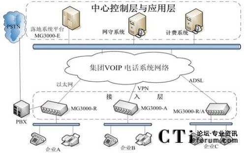 各單位利用自己的網(wǎng)絡(luò)組建集團(tuán)VOIP語音網(wǎng)絡(luò)。無論是在國內(nèi)的各單位總部及其分支還是海外的企業(yè)分支,不管是通過專網(wǎng)還是ADSL等連入集團(tuán)管理平臺,都可以利用這個管理平臺傳輸語音業(yè)務(wù),總部和各分支機構(gòu)可以通過不同的網(wǎng)絡(luò)接入手段。
