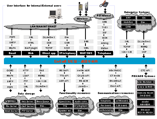 UC統(tǒng)一通信平臺(tái)是通信開發(fā)平臺(tái)的世界領(lǐng)先者, 提供功能強(qiáng)大而又迅速的開發(fā)技術(shù)來建立復(fù)雜的企業(yè)通信服務(wù)。這些技術(shù)包括CTI,傳真,數(shù)據(jù)通信,電子郵件,VXML, HTML,ASR,TTS, WAP,數(shù)據(jù)庫接入等。標(biāo)準(zhǔn)接口讓我們方便的與企業(yè)CRM、ERP、OA等系統(tǒng)連接。