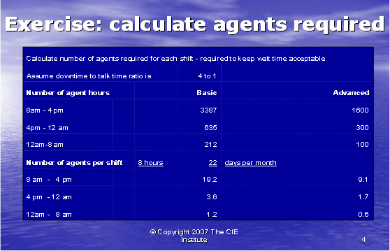 在我們計算出所需的座席數(shù)之前,我們必須了解一個座席的付薪工作時間和他的通話時長的區(qū)別,通話時長是座席真正花在電話上面對客戶的時間。一個座席不會一直處理電話,其它的時間用于培訓,休息,與主管獨處,部門會議,公司內(nèi)部為給客戶提供準確的回答而進行研究,對內(nèi)對外寫郵件,準備下一個客戶的電話。在每個呼叫中心中,通話時長和停工時長的比率是不同的。對于復(fù)雜易變的產(chǎn)品,花在培訓上的時間會更多。在新產(chǎn)品被頻繁介紹的呼叫中心,就需要更多的時間去研究關(guān)于新產(chǎn)品的回答。為了更精確,一個座席一周的工作時長應(yīng)該與其通話時長相比較,以便真正確定通話時長與停工時長的比率。在我們的例子中,我們假設(shè)停工時長和通話時長的比率為4:1,也就是說,每1小時通話時間,相對應(yīng)4小時停工時間。