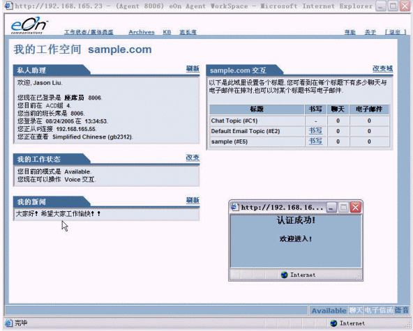 上圖是eQueue坐席員的標(biāo)準(zhǔn)工作界面,其中左側(cè)包含的信息有:坐席員個(gè)人資料、隸屬的坐席組、工作狀態(tài)、可服務(wù)的媒體類型、系統(tǒng)公告;右側(cè)有隊(duì)列中處于等待狀態(tài)的呼叫請求數(shù)量。界面上方設(shè)置有益昂公司特色的知識庫(KB)鏈接,單擊鏈接可以查找到客戶所關(guān)心問題的標(biāo)準(zhǔn)回復(fù)內(nèi)容。在這個(gè)界面里,坐席員可以完成包括語音呼叫、電子郵件在內(nèi)的所有工作。