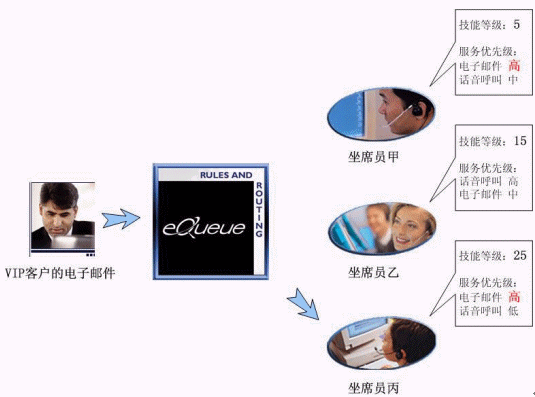 我們假設(shè)在某個(gè)聯(lián)絡(luò)中心里,有甲、乙、丙三位坐席員工作在同一個(gè)項(xiàng)目組(坐席組)。甲是新員工,只具有基本服務(wù)技能,經(jīng)驗(yàn)很有限;乙是一位擁有豐富經(jīng)驗(yàn)的坐席員,語音呼叫應(yīng)答技巧非常嫻熟,具有回復(fù)電子郵件的技能但是熟練程度略低于語音應(yīng)答技能;丙是一位經(jīng)驗(yàn)豐富、技能全面的坐席員,業(yè)務(wù)熟練,其最擅長的是回復(fù)客戶的電子郵件。假設(shè)有一位重要客戶發(fā)來電子郵件咨詢一個(gè)非常專業(yè)的技術(shù)問題。由于這是一位VIP客戶,服務(wù)條款中規(guī)定了他所有的呼叫請求都必須由經(jīng)驗(yàn)豐富的坐席員來響應(yīng)。在eQueue多媒體單一隊(duì)列中,他的電子郵件被限定為坐席員的技能只有達(dá)到或超過等級15才有資格回復(fù)。在3個(gè)坐席員中,甲因?yàn)榧寄艿燃壷挥?,不能滿足回復(fù)郵件的先決條件,雖然擁有此項(xiàng)技能且優(yōu)先級為高,依然沒有資格響應(yīng)這個(gè)聯(lián)絡(luò)請求;乙、丙的技能等級都滿足回復(fù)郵件的條件,但是丙的此項(xiàng)技能服務(wù)優(yōu)先級為高,因此,在丙坐席員處在可服務(wù)狀態(tài)下,eQueue會將此VIP客戶的電子郵件優(yōu)先派發(fā)給她。只有當(dāng)她處于忙碌狀態(tài)時(shí),才會派發(fā)給乙坐席員。