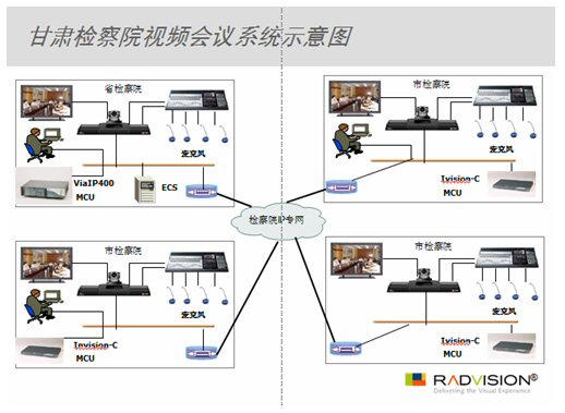 為進(jìn)一步提高檢察系統(tǒng)的工作效率,甘肅省人民檢察院已經(jīng)在其現(xiàn)有網(wǎng)絡(luò)的基礎(chǔ)上建設(shè)覆蓋全省范圍的檢察院專用網(wǎng),并致力于在網(wǎng)絡(luò)內(nèi)建成集領(lǐng)導(dǎo)決策、業(yè)務(wù)處理、信息通訊等為一體的信息管理與服務(wù)的綜合業(yè)務(wù)系統(tǒng)和信息系統(tǒng)資源庫(kù),從而建立起一整套可確保全省人民檢察院工作信息化實(shí)施和發(fā)展的機(jī)制,提高全省檢察機(jī)關(guān)的辦公、辦案效率,為檢察機(jī)關(guān)全面履行法律賦予的職能提供技術(shù)保障。RADVISION視頻會(huì)議系統(tǒng)正是這個(gè)宏大計(jì)劃的重要組成部分。