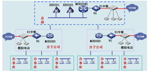集團(tuán)總部和分子公司部署H3C公司的VG80-20作為語音網(wǎng)關(guān),VG 80-20提供2個(gè)E1語音接口用于接連接程控電話交換機(jī)PBX的E1中繼線,通過以太網(wǎng)口連接到IP網(wǎng)中。