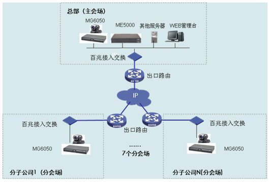 集團(tuán)總部主會(huì)場(chǎng)和各個(gè)分會(huì)場(chǎng)各部署一臺(tái)H3C公司的MG6050多媒體網(wǎng)關(guān),同時(shí)支持H.323和SIP協(xié)議,支持H.263/H.264編碼技術(shù)和4CIF高清晰圖像分辨率,最高可以提供2M會(huì)議帶寬。集團(tuán)總部主會(huì)場(chǎng)和各個(gè)分會(huì)場(chǎng)推薦使用Sony