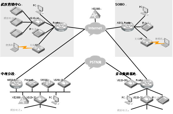 要求實現(xiàn)IP語音網(wǎng)絡(luò)向廣域網(wǎng)的擴(kuò)展,實現(xiàn)IP語音無處不在,內(nèi)部電話完全免費。并保證廣域網(wǎng)的安全訪問。