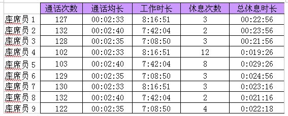 上面這張表格,畫出的就是9個(gè)座席員的話務(wù)數(shù)據(jù)情況,分別列出了通話次數(shù)、通話均長(zhǎng)、工作時(shí)長(zhǎng)、休息次數(shù)、總休息時(shí)長(zhǎng)這五個(gè)KPI指標(biāo),你可以看的出來(lái)是哪一個(gè)座席員在呼攸嗎?