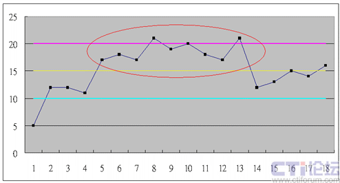 12就是數據有12個點,像是鋸齒一樣,在均值上下連續(xù)跳動(六西格瑪用到了14個點,我認為呼叫中心觀察到12個點就應該可以確認有特殊原因了)。