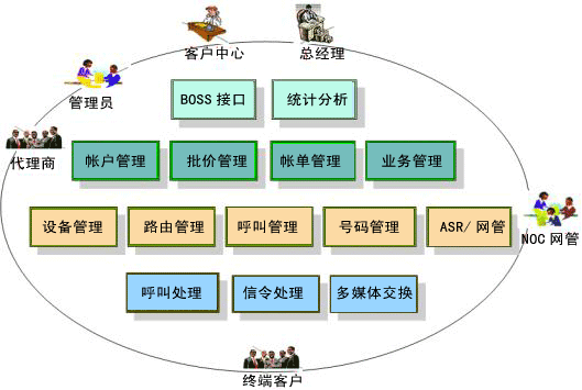 | 呼叫處理 | 設(shè)計原則: 處理接受終端用戶的呼叫請求。 代理向policy請求呼叫認證系統(tǒng) 中每一個呼叫,負責上報給policy,并接受policy的指示。 功能: 設(shè)備管理:包括:設(shè)備信息管理、設(shè)備號碼管理、用戶的路由策略決定,統(tǒng)計分析、綜合查詢等等。 路由管理:為管理者全方位地管理系統(tǒng)擁有的路由資源,并對這些資源進行開發(fā)提供決策支持。如為不同的客戶不同的要求,提供最適合的路由組合。 呼叫管理:監(jiān)控系統(tǒng)現(xiàn)在正在進行的通話,讓管理者實時了解系統(tǒng)當前的業(yè)務(wù)狀況。 ASR統(tǒng)計:讓管理員實時了解系統(tǒng)的近一段時間的各類用戶,各路由的接通率,平均通話時長等。 網(wǎng)管:提供管理員管理每個設(shè)備的信息,并提供遠程登錄管理到Internet上任何注冊到系統(tǒng)上的設(shè)備。 帳戶管理:管理系統(tǒng)中的每一個帳戶,支持多級的帳戶管理。上一級可以依據(jù)權(quán)限對下一級進行管理。 批價管理:為各種帳戶提供與其相適應(yīng)的價格策略,以最低的成本最有效地激勵客戶。如定制打折,套餐等不同的定價策略. 帳單管理:為每個帳戶提供定時準確帳單收據(jù)。可生成 Word、Excel、txt 等不同格式的帳單明細報表和統(tǒng)計報表。 業(yè)務(wù)管理:為每個用戶提供各種不同用戶所需要的業(yè)務(wù),并能快速的提供新的業(yè)務(wù)。如呼叫轉(zhuǎn)移,呼叫等待等業(yè)務(wù)。 |