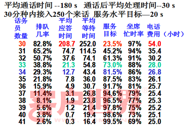 服務(wù)水平與通話量、服務(wù)時(shí)呈反向關(guān)系,與座席數(shù)目呈正向關(guān)系。為維持目標(biāo)水平,當(dāng)通話量、處理時(shí)長(zhǎng)增加時(shí),就需要增加座席,反之,座席數(shù)目則可以適當(dāng)減少。