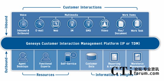 Genesys Customer Interatcion Management Platform是一個開放、可擴充、有彈性的客戶管理交互平臺。它是建構客服中心的核心 ,所有Genesys解決方案模塊 ,包含企業(yè)智能路由(Enterprise Routing Solution)、智能網端智能路由(Network Routing Solution)、外撥解決方案(Outbound Contact Solution)、互聯(lián)網解決方案(Internet Contact Solution)、勞動力管理方案(Workforce Management Solution)等等都是建構在Genesys的基礎平臺之上。使得Genesys所有的模塊都可充份整合在一起 ,提供客戶全方位、全功能的企業(yè)交互解決方案。