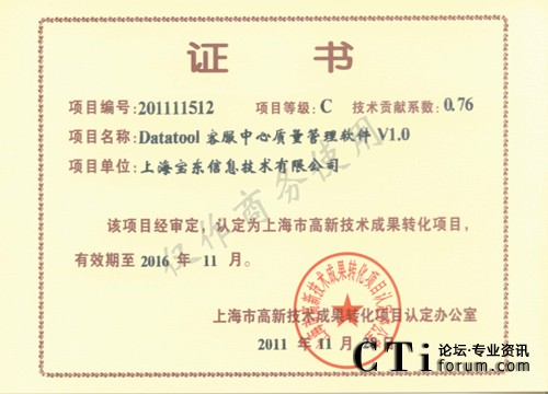 CTI論壇(ctiforum)12月7日消息(記者 張潔):2011年的最后一個月,寶東公司傳來又一好消息,公司的開發(fā)團(tuán)隊(duì)自主開發(fā)研制的針對呼叫中心客服的質(zhì)檢軟件“Datatool 客服中心質(zhì)量管理軟件(簡稱DTQM)”經(jīng)過市高新技術(shù)轉(zhuǎn)化項(xiàng)目認(rèn)定辦公室層層審報(bào)審批,最終經(jīng)審定,被認(rèn)定為市高新技術(shù)成果轉(zhuǎn)化項(xiàng)目。