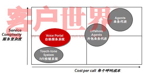 讓我們來(lái)看看這張圖。這張圖縱軸是服務(wù)的復(fù)雜度,橫軸是單位呼叫成本,傳統(tǒng)的IVR(觸鍵的語(yǔ)音IVR)和人工服務(wù)相比,服務(wù)的復(fù)雜度可就差多了。而Voice Portal的概念是用比較少的成本做更多的業(yè)務(wù),從成本上講比原來(lái)的傳統(tǒng)的IVR可能成本稍微高一點(diǎn)點(diǎn),但是和人工服務(wù)相比,無(wú)論是和單位自建呼叫中心座席比,還是和外包呼叫中心座席比,成本都有很大降低,但業(yè)務(wù)復(fù)雜度可以做得比傳統(tǒng)IVR復(fù)雜很多。我們承認(rèn),就提供服務(wù)的內(nèi)容來(lái)講,Voice Portal今天仍然不能夠像人工那樣提供那么全面的服務(wù),但是可以涵蓋很多服務(wù)內(nèi)容,在這方面一是因?yàn)榧夹g(shù)先進(jìn)了,另一方面也在于引導(dǎo)。今天我看到越來(lái)越多的客戶已經(jīng)開(kāi)始有意識(shí)的推行自助服務(wù)形式。我前幾年去新加坡打出租,發(fā)現(xiàn)在新加坡有很多叫出租的車(chē)站,車(chē)站上有一個(gè)按鍵,按鍵上有一個(gè)編碼,說(shuō)明你在什么位置,當(dāng)你打通出租車(chē)客服的電話,你只要告訴這個(gè)編碼,他們就自然而然知道你在什么地方,并把要來(lái)接你的車(chē)車(chē)牌號(hào)通過(guò)語(yǔ)音報(bào)讀方式通知你。今天在中國(guó)也開(kāi)始有這種形式了。昨天我沒(méi)有開(kāi)車(chē),也算是支持北京市每周少開(kāi)一天車(chē)的號(hào)召,我打了出租,在和出租司機(jī)聊天的過(guò)程中,出租司機(jī)說(shuō)現(xiàn)在油價(jià)很貴,他們有很強(qiáng)烈的需求不愿意掃馬路,他們也有一個(gè)出租車(chē)叫車(chē)電話,那個(gè)呼叫中心大概有上百個(gè)坐席,這個(gè)公司有一萬(wàn)六千輛出租車(chē)在北京,由他們來(lái)進(jìn)行搶答,搶答完之后你可以告訴說(shuō)這個(gè)人在什么地方等,唯一不同的我們?cè)谧灾线沒(méi)有做得那么到位,司機(jī)搶到了活還要給客戶打一個(gè)電話,不象新加坡完全是自助的,你只要按了那個(gè)鍵,系統(tǒng)就知道你在什么地方,當(dāng)尋找到合適的車(chē)的時(shí)候,語(yǔ)音報(bào)讀你車(chē)牌號(hào)就行了。我和說(shuō)出租車(chē)師傅,那你打電話成本不是增加了嗎,他一笑,增加打一個(gè)電話的成本怎么也比掃馬路強(qiáng)。大家可以看看呼叫中心多有用,自助服務(wù)能省多少錢(qián)。