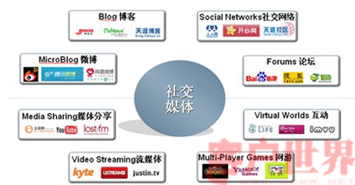 在國外這些網(wǎng)絡新媒體包括: SNS社交網(wǎng)絡(如FACEBOOK)、BLOGS博客、WIKI維基(WIKIEPEDIA\WIKITRAVEL、內容分享(如圖片分享FLICKR\視頻分享YOUTUBE\社會標簽DEL)、社區(qū)(包括傳統(tǒng)的BBS社區(qū)和新興的3D社區(qū)如第二人生等)和微博(如TWITTER)等。在國內也涌現(xiàn)了一批社交媒體,如新浪、騰訊微博,天涯社區(qū)、開心網(wǎng)等。