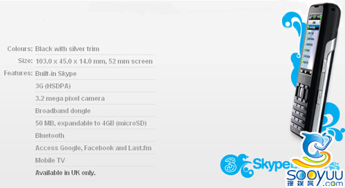 這款新的Skypephone S2內(nèi)置了Skype,可以通過Skype來享受更加便宜的話費(fèi),同時該機(jī)也內(nèi)置了Google和Facebook手機(jī)客戶端,可以便捷訪問。這款機(jī)器采用了黑色與銀色搭配,手機(jī)機(jī)身尺寸為103.0×45.0×14.0mm,支持HSDPA技術(shù),支持手機(jī)電視功能,支持藍(lán)牙,手機(jī)搭載了一枚320萬像素攝像頭,機(jī)身有約50MB內(nèi)存,支持?jǐn)U展,最高到4GB。比較遺憾的是該機(jī)目前只有在英國有售。
