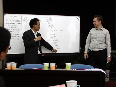 公開(kāi)課在Simon Kriss先生詼諧的講課風(fēng)格的引導(dǎo)下自始至終在輕松、愉快又不失專業(yè)深度的氛圍中進(jìn)行著,而Simon Kriss先生以呼叫中心運(yùn)營(yíng)管理的高效率為主題,從呼叫中心的環(huán)境布局、預(yù)測(cè)管理、人力資源管理、效率管理到專業(yè)報(bào)告形式等知識(shí)點(diǎn)上做了專業(yè)深入的講解。尤其在人力資源管理和效率管理方法的傳授時(shí)引發(fā)了全體學(xué)員極大的興趣和反應(yīng),例如:就人員附著度的定義及操作問(wèn)題學(xué)員同講師展開(kāi)了多倫次的討論。而Simon