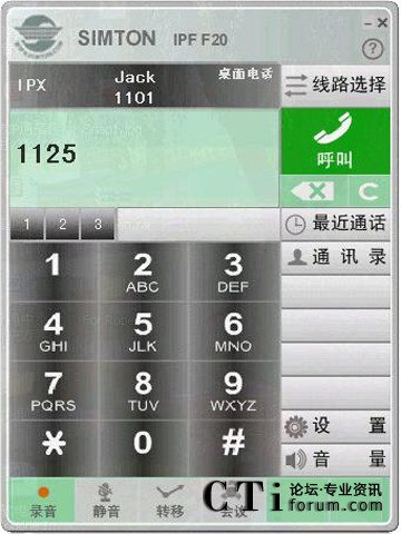 企業(yè)版需要另行購買,突出的功能包括“電子通信錄”、“軟電話與臺(tái)式電話機(jī)綁定”等。“電子通訊錄”功能已預(yù)裝在軟電話中,就像手機(jī)的通訊薄一樣。企業(yè)的員工不需要自己逐條輸入通訊錄,錄入與更新由企業(yè)的系統(tǒng)管理員在企業(yè)的通訊服務(wù)器上進(jìn)行,一人操作,全公司通訊錄同步更新。一個(gè)集團(tuán)公司或政府機(jī)構(gòu)有成百上千個(gè)員工很正常,但要讓大家記住這幾百個(gè)電話號(hào)碼就很困難了,目前較為常見的解決辦法有以下幾種,小一點(diǎn)的企業(yè)或機(jī)構(gòu)通常會(huì)打印一張通訊錄發(fā)放給每個(gè)員工,員工撥號(hào)前會(huì)先查一下這張通訊錄然后再將電話號(hào)碼在臺(tái)式辦公電話機(jī)上逐個(gè)輸入;規(guī)模大一點(diǎn)的企業(yè)會(huì)專門印制一本通訊薄發(fā)給每個(gè)員工,但由于機(jī)構(gòu)龐大,往往等到通訊簿發(fā)到手上,其中有很多電話號(hào)碼已經(jīng)不正確了。F20型軟電話的“與臺(tái)式電話機(jī)綁定”功能就很好的解決了這個(gè)問題,通過將電腦上的軟電話與辦公桌上的臺(tái)式電話機(jī)進(jìn)行綁定,企業(yè)中的所有員工在打電話時(shí),都可以先點(diǎn)擊電腦軟電話中的通訊錄,快速找到需要的電話號(hào)碼,然后只需點(diǎn)擊這個(gè)號(hào)碼條,這個(gè)員工的臺(tái)式電話機(jī)就會(huì)自動(dòng)向目標(biāo)電話進(jìn)行撥號(hào),待對(duì)方摘機(jī)后,這個(gè)員工的臺(tái)式電話機(jī)就會(huì)響起鈴聲,此時(shí)摘機(jī)就可進(jìn)行通話了。確實(shí)夠方便,夠?qū)嵱茫?