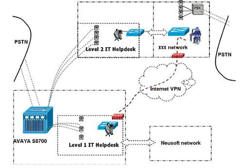 實施中,A公司的IT Helpdesk服務(wù)熱線號碼直接路由至東軟呼叫中心平臺,Level 1座席用東軟呼叫中心的分機提供在線服務(wù);Level