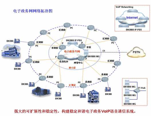 MG和BN2000 IP PBX就可以利用電子政務網自身的優(yōu)勢,實現(xiàn)VoIP語音通信。電子政務網內的所有IP電話用戶統(tǒng)一在核心層的BN2000