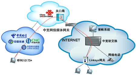 企業(yè)或個(gè)人自行從網(wǎng)站上成功申請“企業(yè)商務(wù)通”或“個(gè)人隨身行”業(yè)務(wù)后,通過101756*全國統(tǒng)一接入號結(jié)合中寬網(wǎng)信推薦的思科linksys網(wǎng)關(guān)或網(wǎng)絡(luò)電話使用,當(dāng)外部對您申請的10175*號碼發(fā)起呼叫時(shí),該呼叫通過中國聯(lián)通的線路將話務(wù)指向中寬網(wǎng)信的媒體網(wǎng)關(guān),由中寬軟交換平臺(tái)將呼叫送至您指定的電話上。另外,當(dāng)您使用該業(yè)務(wù)外呼時(shí),可以選擇在被叫電話上顯示10175*或隱藏號碼。