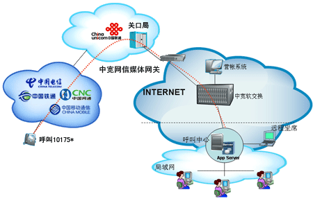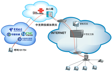企業(yè)自行從網(wǎng)站上成功申請“企業(yè)商務(wù)通”業(yè)務(wù)后,通過101756*全國統(tǒng)一接入號結(jié)合網(wǎng)關(guān)和PBX,當(dāng)外部對企業(yè)申請的10175*號碼發(fā)起呼叫時(shí),該呼叫通過中國聯(lián)通的線路將話務(wù)指向中寬網(wǎng)信的媒體網(wǎng)關(guān),由中寬軟交換平臺(tái)將呼叫送至指定的PBX上,由PBX接續(xù)至總臺(tái)或相應(yīng)分機(jī)。另外,當(dāng)您使用該業(yè)務(wù)外呼時(shí),可以選擇在被叫電話上顯示10175*或隱藏號碼。