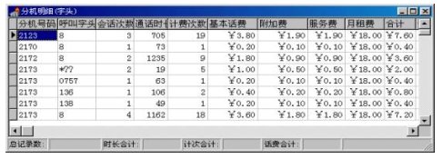 用戶可以撥打話費查詢電話號碼,話費查詢系統(tǒng)會提示用戶輸入查詢密碼,然后提示選擇余額查詢/時段查詢。用戶選擇時段查詢,查詢系統(tǒng)會提示用戶輸入查詢時段,然后自動將該時段內(nèi)的話費統(tǒng)計出來,合成語音,報給用戶。時段話費查詢必須與LANBIRD計費/收費系統(tǒng)配合使用,利用網(wǎng)絡共享分機話費數(shù)據(jù)表,否則系統(tǒng)將得不到數(shù)據(jù)而無法工作。LANBIRD計費/收費系統(tǒng)可以與查詢繳系統(tǒng)無縫集成,不需任何人工操作。如果采用地三方的計費軟件,則須用手轉(zhuǎn)換,或用我們的自動轉(zhuǎn)換模塊,不過由于不同的計費系統(tǒng),話費存儲格式不同,自動轉(zhuǎn)換模塊需要專門開發(fā)。